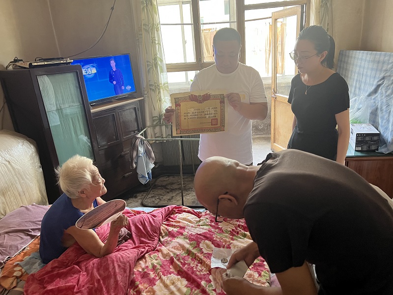 6月28日,安裝公司、物業(yè)公司聯(lián)合旱西關(guān)東社區(qū)工作人員組成慰問(wèn)小組開(kāi)展“慰問(wèn)抗美援朝老兵遺孀 真情傳遞溫暖人心”慰問(wèn)活動(dòng)?;顒?dòng)中,慰問(wèn)組一行前往抗美援朝老兵史黑則遺孀家中,詳細(xì)詢問(wèn)了老人的生活和身體情況,叮囑老人要保重身體、安享晚年,并送去了牛奶、瓜果等慰問(wèn)品。同時(shí),慰問(wèn)組一行還看到了保存多年的獎(jiǎng)?wù)录白C書(shū),大家紛紛表示要繼承革命先輩的光榮傳統(tǒng),汲取紅色力量,堅(jiān)定奮進(jìn)步伐,用實(shí)際行動(dòng)迎接黨的二十大勝利召開(kāi)。