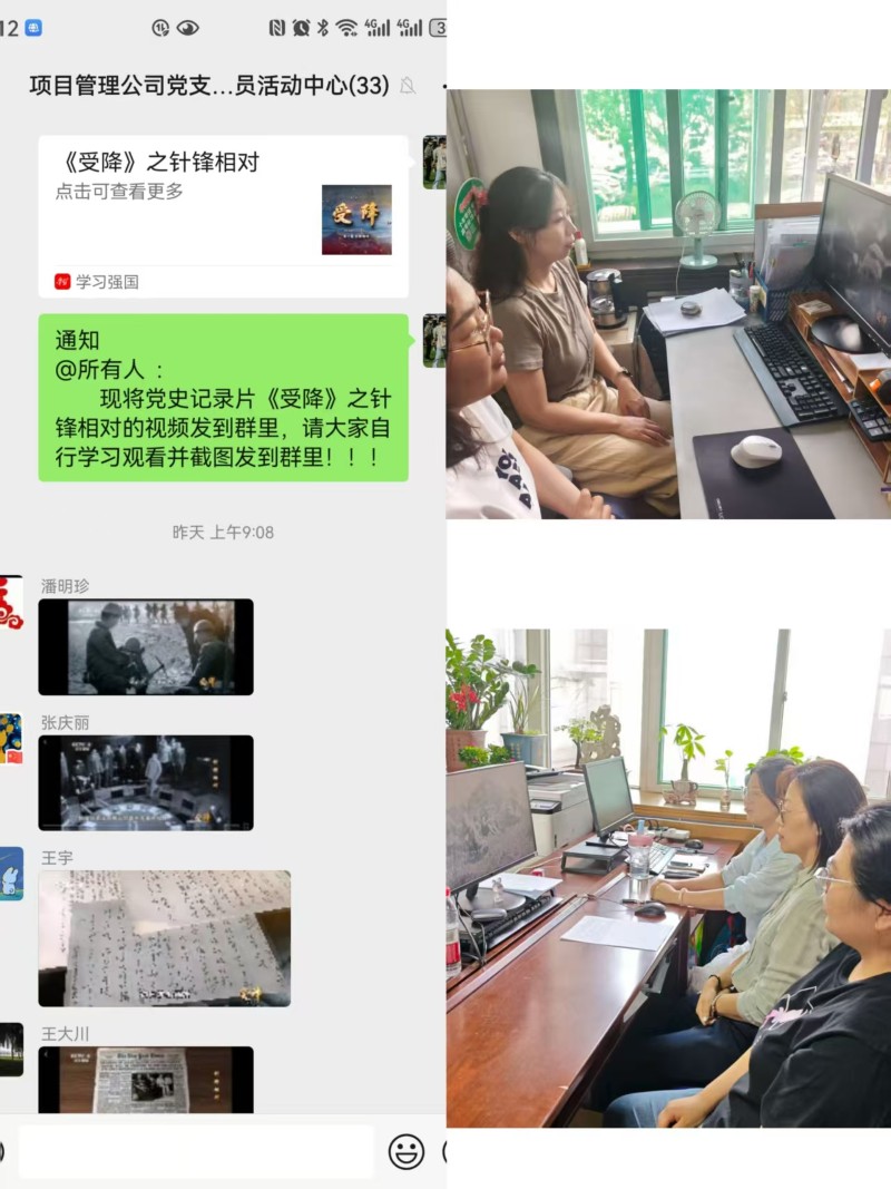 9月1日,項(xiàng)目管理公司黨支部開展“重溫歷史 奮勇爭先”主題活動?;顒又?,全體黨員干部共同觀看黨史紀(jì)錄片《受降》,紀(jì)錄片以詳實(shí)的史料、珍貴的影像生動展現(xiàn)中國共產(chǎn)黨始終以人民利益為根本,在復(fù)雜形勢下堅(jiān)守信仰、運(yùn)籌帷幄的政治智慧和使命擔(dān)當(dāng),引導(dǎo)黨員干部不斷加強(qiáng)黨史學(xué)習(xí),切實(shí)把優(yōu)秀歷史經(jīng)驗(yàn)轉(zhuǎn)化為推動工作的實(shí)際行動。