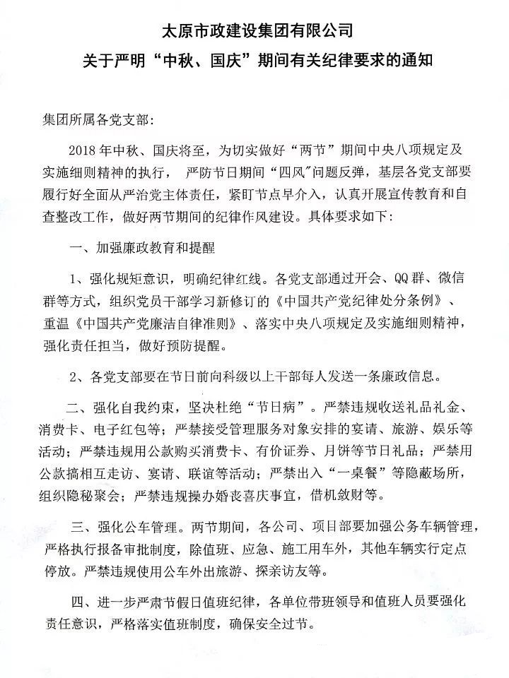 太原市政建設(shè)集團(tuán)有限公司關(guān)于嚴(yán)明“中秋、國慶”期間有關(guān)紀(jì)律要求的通知