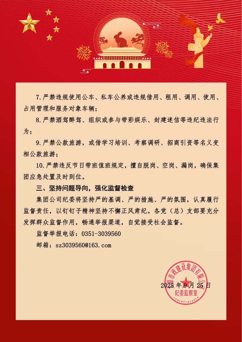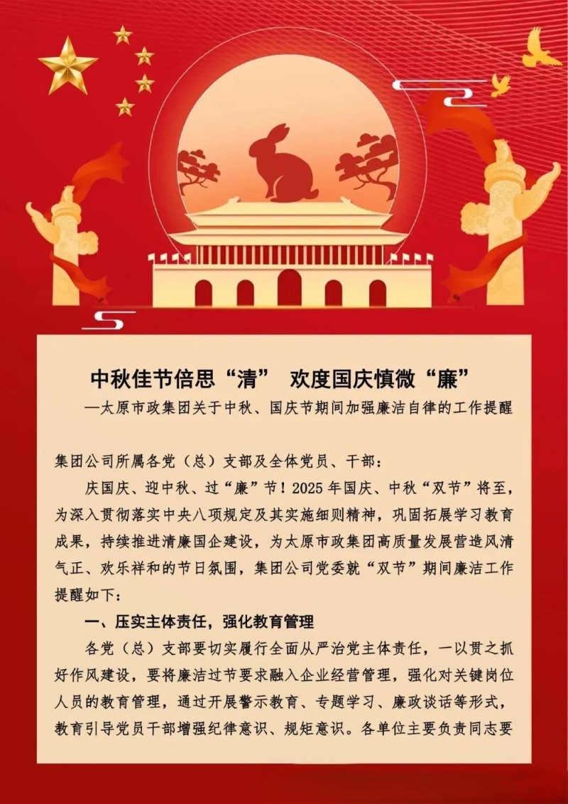 太原市政集團(tuán)關(guān)于中秋、國(guó)慶節(jié)期間加強(qiáng)廉潔自律的工作提醒