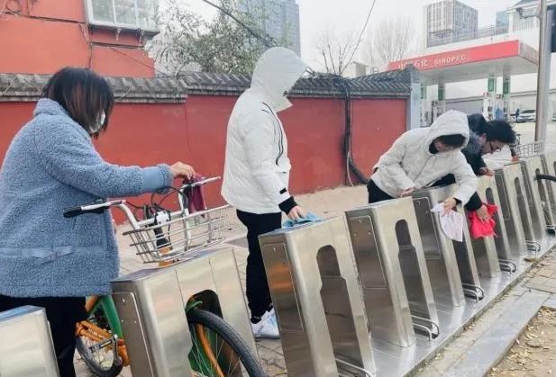 活動中,志愿者們對太原市第二十中學校門前的公交自行車停放點進行了擦拭,并將車輛擺放整齊,以實際行動為美化城市貢獻力量。