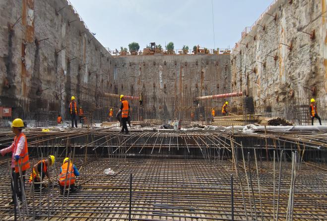 自工程開工以來,項(xiàng)目部合理規(guī)劃、統(tǒng)籌安排,先后完成了三軸水泥土攪拌樁、地下連續(xù)墻、抗拔樁、冠梁等一個(gè)又一個(gè)節(jié)點(diǎn)目標(biāo),高效推進(jìn)工程建設(shè)。6月,為趕在汛期來臨前完成調(diào)蓄池和泵房底板混凝土澆筑的施工任務(wù),項(xiàng)目部做足前期保障工作,針對基坑內(nèi)作業(yè)面狹窄,土方、鋼筋、模板、混凝土澆筑等工程量大的情況。項(xiàng)目部緊密圍繞節(jié)點(diǎn)目標(biāo),從人員配置、材料供應(yīng)、安全措施、設(shè)備保障等方面進(jìn)行全面規(guī)劃、統(tǒng)籌部署,保證各工序相互銜接、有序推進(jìn)。同時(shí),項(xiàng)目部采取對人、材、機(jī)進(jìn)行動(dòng)態(tài)調(diào)整的方法,24小時(shí)不間斷安排作業(yè),確保多個(gè)作業(yè)面同時(shí)施工,嚴(yán)格按日計(jì)算施工進(jìn)度,全力推動(dòng)工程進(jìn)展。