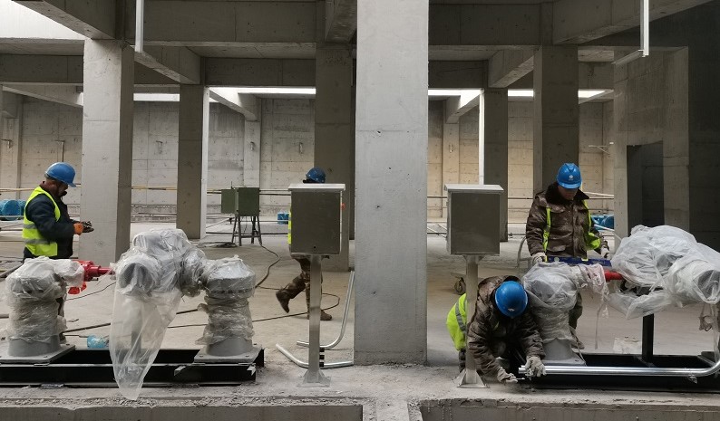 該工程作為太原市最大的地下雨水泵站,工程設(shè)備數(shù)量多、單體體積大、安裝工作體量大、工藝繁雜。為了后期對蓄水池底部的沉渣進行沖洗,工程中安裝使用了國際先進的水洗門,此設(shè)備與墻體的密閉性要求較高,安裝精度需要控制在±2毫米以內(nèi)。項目部多次與設(shè)計人員、設(shè)備廠家、技術(shù)指導(dǎo)人員、施工人員進行溝通交流,針對施工中的技術(shù)難點,確定合理施工方案,廠家技術(shù)人員全程現(xiàn)場觀察、指導(dǎo)。施工人員嚴(yán)謹(jǐn)細(xì)致,確保安裝設(shè)備的平整度和水平度,并根據(jù)廠家技術(shù)人員建議調(diào)整施工細(xì)節(jié),保證了施工的準(zhǔn)確性。同時項目部加強現(xiàn)場監(jiān)護、安全隱患排查、巡查管理,對檢查中發(fā)現(xiàn)的問題及安全隱患,及時跟蹤,并落實整改,全力保障施工安全。