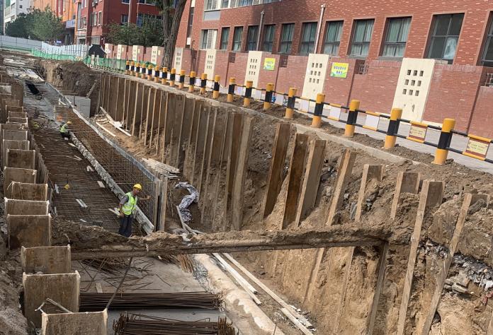 施工中,面對無法開展大面積施工,且施工路段無放坡條件等難題,項目部迅速行動、倒排工期,將工期分解到周、計劃到天,各項安排落到實處,明確全員崗位職責,組織機械和人工齊上陣,同時展開多個作業(yè)面,加速推進工程進展。在黑土巷中橫馬路郝家溝路段施工中,項目部采用打設鋼板樁支護措施,有效保障周邊建筑物安全,且該路段施工場地緊鄰學校,為不影響師生九月初正常通行,項目部安排施工人員加班加點對周邊拆遷產生的大量建筑垃圾和渣土進行清運,并集中力量加快推進該路段的施工進度,組織人員晝夜輪替兩班倒,確保趕在正式開學前完成施工任務。