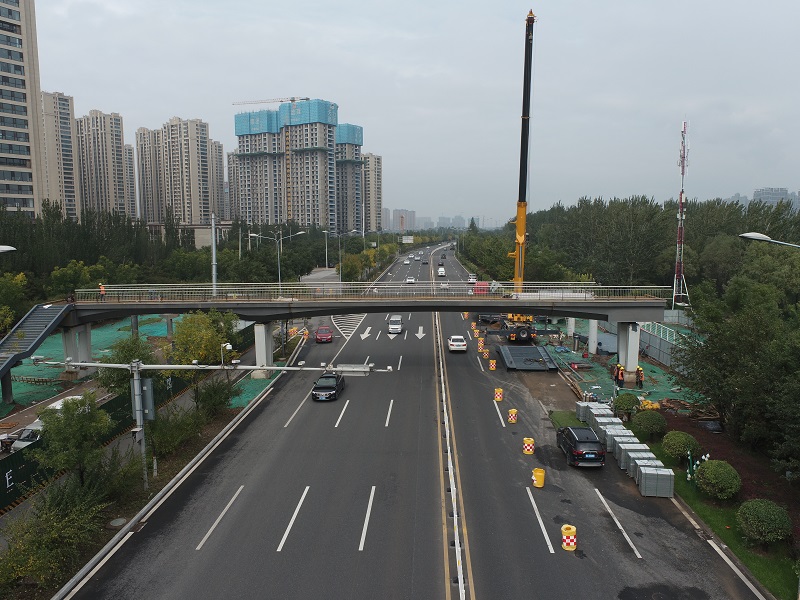 十項目部承建的北中環(huán)森林公園人行天橋主橋長度為93.8米,必須進(jìn)行分段吊裝。10月8日,項目部協(xié)調(diào)多臺500噸吊車進(jìn)場,在不影響車輛正常通行的情況下,利用夜間時間加緊進(jìn)行吊裝。同時,因時間緊,任務(wù)重,在灌注樁施工中,項目部全體參建人員精心配合、各司其職,人材機各方面緊密配合,確保按計劃時間節(jié)點完成每日工作量,為日后主橋吊裝作業(yè)節(jié)省出更多寶貴時間。截至目前,承建的三座人行天橋鋼箱梁主體結(jié)構(gòu)已全部完成。北中環(huán)森林公園南門人行天橋兩側(cè)欄桿安裝和主橋大理石鋪裝已完成,正在進(jìn)行南北兩側(cè)梯道坡道欄桿安裝和大理石鋪裝;濱河西路市圖書館北側(cè)人行天橋西側(cè)坡道吊裝已完成,下一步將進(jìn)行東側(cè)坡道吊裝、橋面鋪裝及護(hù)欄安裝;濱河西路三給街口人行天橋兩側(cè)梯坡道已吊裝完成,下一步將進(jìn)行梯坡道安裝和主橋大理石鋪裝。