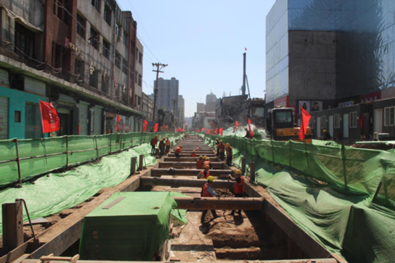 解放路改造工程施工二標(biāo)段北起東三道巷,南至迎澤大街,道路長約2.8公里,由二公司負(fù)責(zé)承建。該工程涉及道橋建設(shè)、線纜入地、風(fēng)貌整飾、設(shè)施完善、歷史文化保護(hù)傳承等方方面面。因施工位于主城區(qū),施工環(huán)境復(fù)雜,涉及多家施工隊(duì)伍同時(shí)作業(yè),項(xiàng)目部多方聯(lián)系、加強(qiáng)管理,通過與地鐵、管線等施工方溝通,合理分配施工節(jié)點(diǎn),動(dòng)態(tài)管理各個(gè)環(huán)節(jié),利用短短一個(gè)半月時(shí)間順利完成了整體管線施工任務(wù),為后續(xù)施工打下堅(jiān)實(shí)基礎(chǔ)。管線施工中,項(xiàng)目部采取人工挖設(shè)探坑,明確管線具體位置,再通過打設(shè)鋼板樁+高壓旋噴樁的形式,加固兩側(cè)土體,確保開挖作業(yè)順利進(jìn)行,同時(shí),項(xiàng)目部調(diào)整開挖工作面長度,因解放路管線眾多需在保護(hù)安全的前提下進(jìn)行施工,項(xiàng)目部一改以往數(shù)十米一個(gè)開挖面的傳統(tǒng)方法,每間隔五米或十米開挖一個(gè)工作面,確保管線的正常運(yùn)行,圓滿完成了施工任務(wù)。經(jīng)過6個(gè)多月的緊張施工,解放路改造工程如期竣工通車。該工程是太原市第一條集地面道路交通和地下軌道交通同步推進(jìn)的綜合性改造工程。全體施工人員弘揚(yáng)“市政”精神,展現(xiàn)“鐵軍”風(fēng)采,優(yōu)質(zhì)高效完成施工任務(wù),為全市人民交上了一份完美答卷,為再現(xiàn)“錦繡太原城”盛景貢獻(xiàn)了新時(shí)代市政力量。