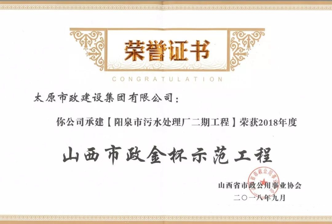 9月20日,太原市政建設(shè)集團(tuán)有限公司承建的太茅路改造工程三標(biāo)段、陽(yáng)泉市污水處理廠(chǎng)二期工程、上莊街(西中環(huán)——少管所三岔口)道路改造工程、太茅路(康寧街——迎賓路)改造工程二標(biāo)段榮獲山西省市政公用事業(yè)協(xié)會(huì)頒發(fā)的2018年度“山西市政金杯示范工程”榮譽(yù)稱(chēng)號(hào)。