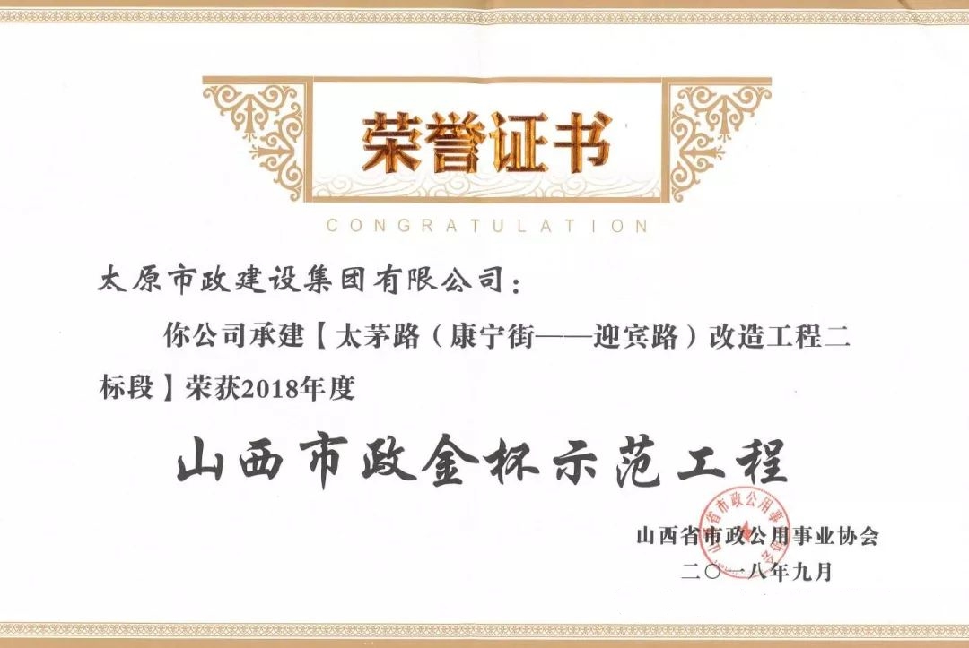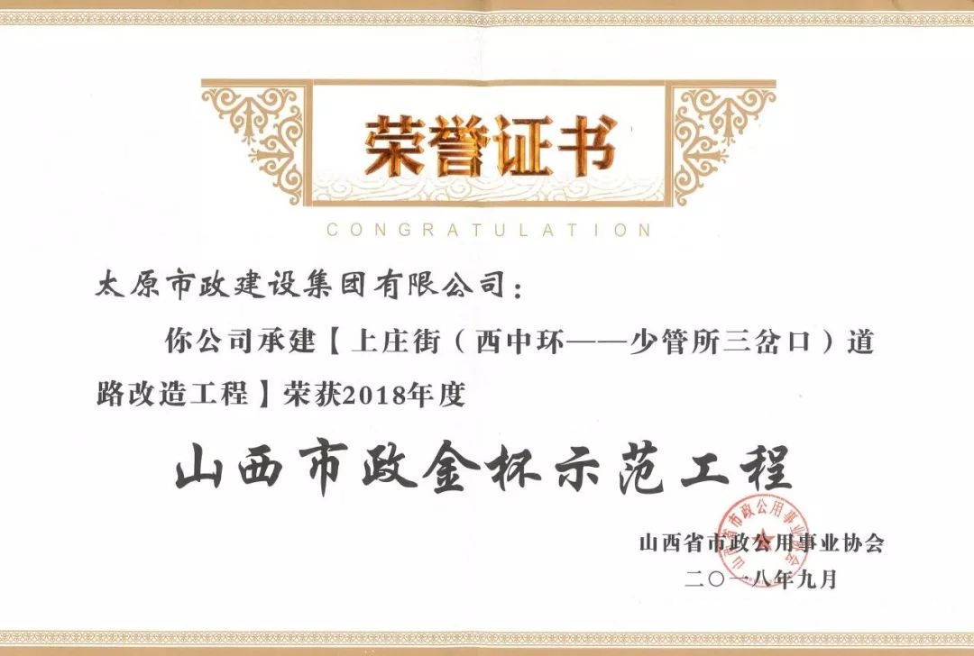 太原市政建設(shè)集團(tuán)有限公司多項(xiàng)工程喜獲山西省市政金杯示范工程榮譽(yù)稱(chēng)號(hào)