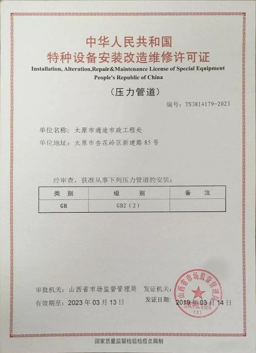 3月14日,通途市政工程處喜獲山西省市場監(jiān)督管理局頒發(fā)的中華人民共和國特種設(shè)備安裝改造維修許可證,獲準從事GB2(2)壓力管道的安裝。這是通途市政工程處在資質(zhì)業(yè)務(wù)上的又一重大突破,開辟了經(jīng)營范圍的新領(lǐng)域,為企業(yè)今后的多元化發(fā)展奠定了良好基礎(chǔ)。