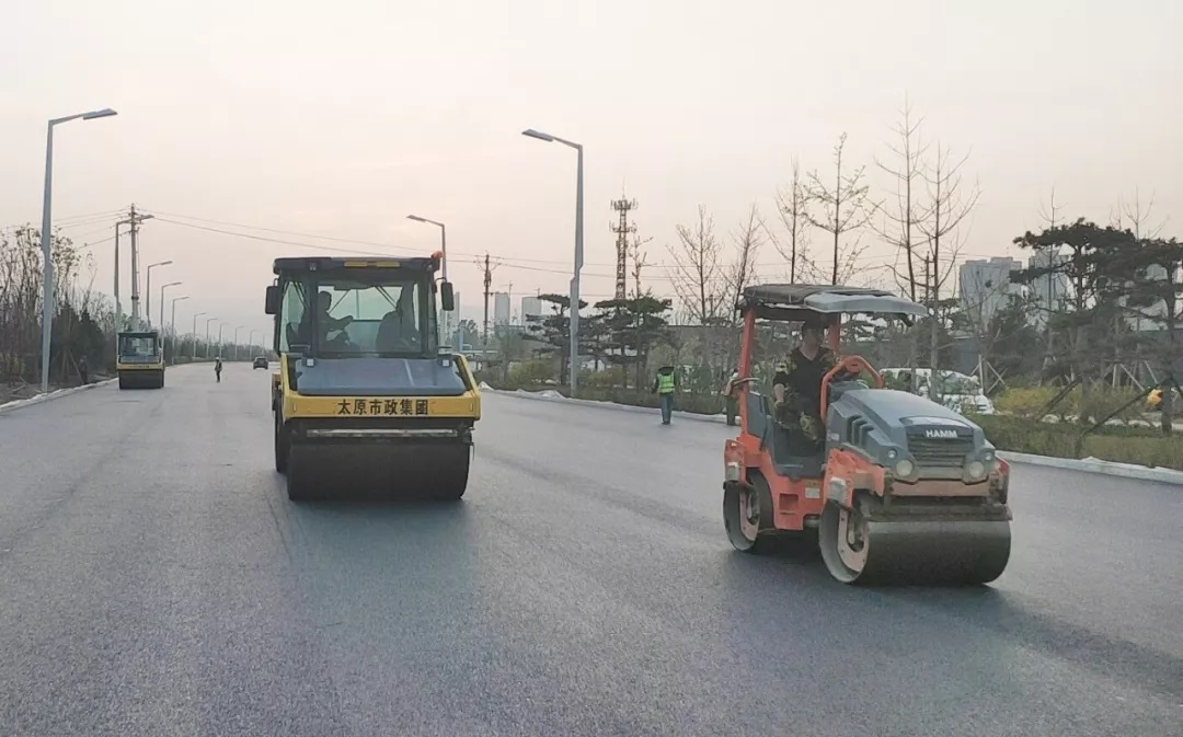 太原市政建設(shè)集團(tuán)有限公司蒙山大街道排工程機(jī)動(dòng)車(chē)道與非機(jī)動(dòng)車(chē)瀝青上面層已鋪筑完成
