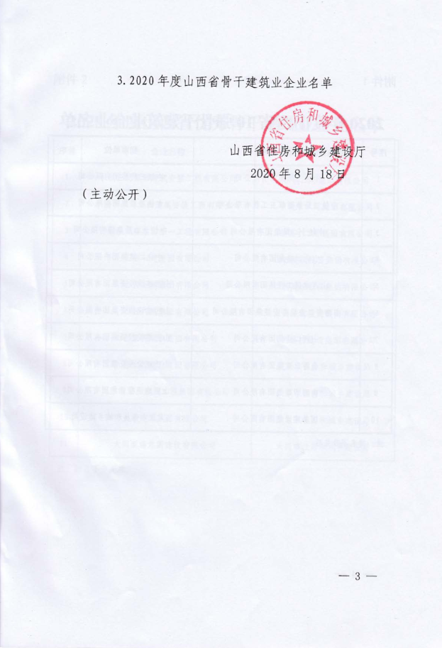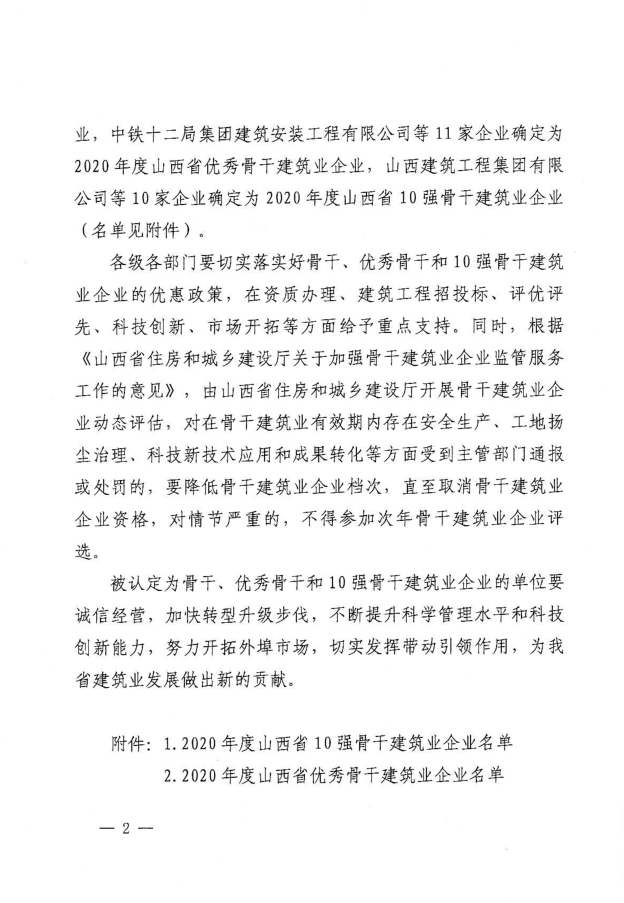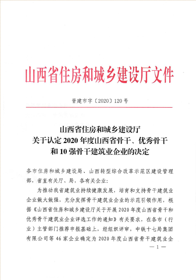近日,山西省住房和城鄉(xiāng)建設廳發(fā)布《關于認定2020年度山西省骨干、優(yōu)秀骨干和10強骨干建筑業(yè)企業(yè)的決定》,集團公司再次被認定為“山西省優(yōu)秀骨干建筑業(yè)企業(yè)”。