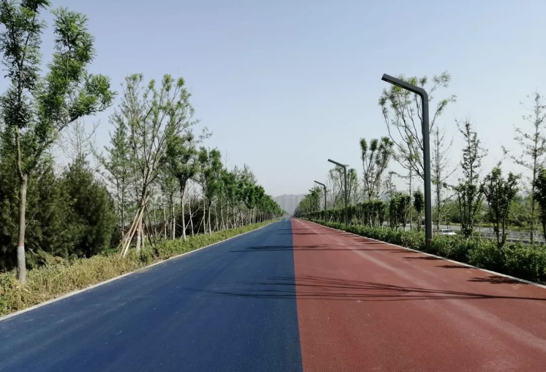 在道路鋪設(shè)過程中,為契合“二青”會體育精神,項目部在該工程面層鋪設(shè)彩色瀝青,不僅使路面更加干凈美觀,也為場館周邊道路增添一抹運(yùn)動色彩。由于東大堤頂涉及國際自行車賽道,項目部制定可行性方案,在1、2號出入口施工中,采用墻端倒圓角處理,確保交通安全順暢。工程建設(shè)中,項目部全體參建人員不忘初心,堅守使命,以熱情燃燒“卡路里”,助力品質(zhì)工程建設(shè)。